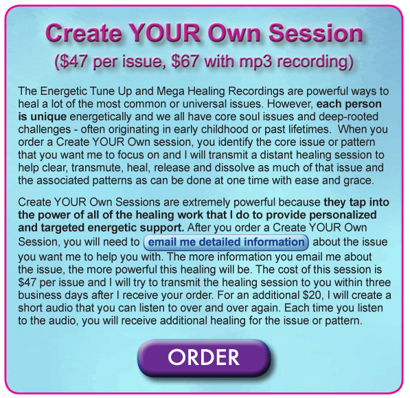 The cost of each personalized Create Your Own Energy Healing and Growth Session is $60, and includes General Balancing. Your sessions will be transmitted approximately four business days from the receipt of your order. (Sessions will not be transmitted during holidays.) For $10 extra, I will make an audio recording to transmit the energies of the session to you that you can listen to over and over again.